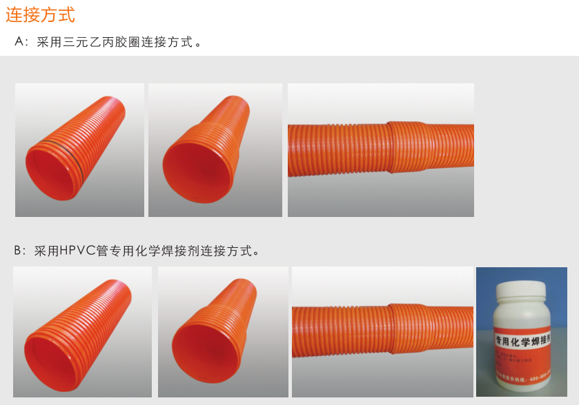 高強度聚氯乙烯(HPVC)雙壁波紋管內、外壁之間呈中空環狀結構,充分利用工字鋼結構原理,提高截面 慣性矩,環鋼度高。產品具有強度高、韌性好、質地輕等優點。產品運用開挖工程,可代替MPP單壁波紋管、玻璃鋼管、PVC-C電力管、PVC-U通信管等管材。